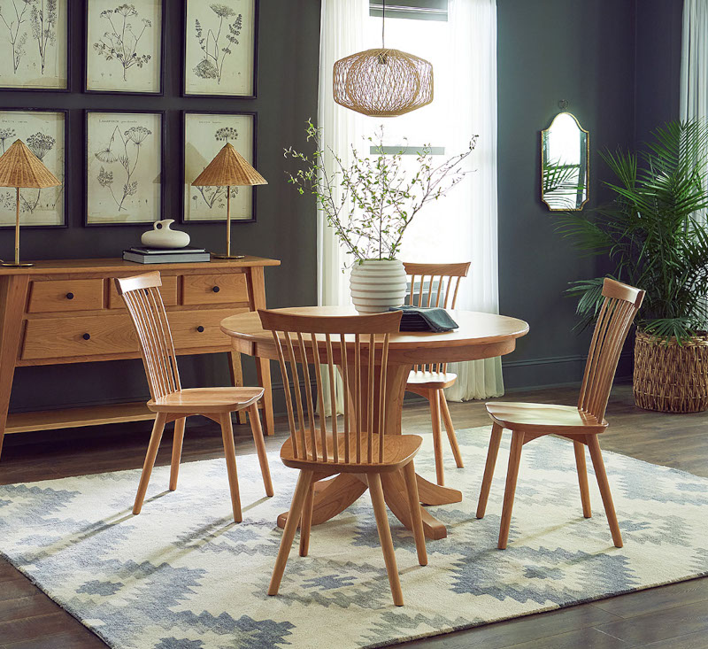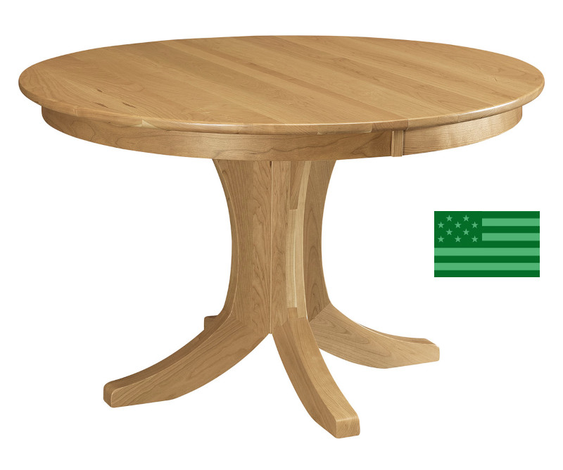 Our Amish Bali Pedestal Dining Table, shown here in Cherry with Natural stain, features a 1" thick solid top. Our Amish dining room tables are made with solid hardwoods sustainably grown and harvested in the USA. Made in Indiana.