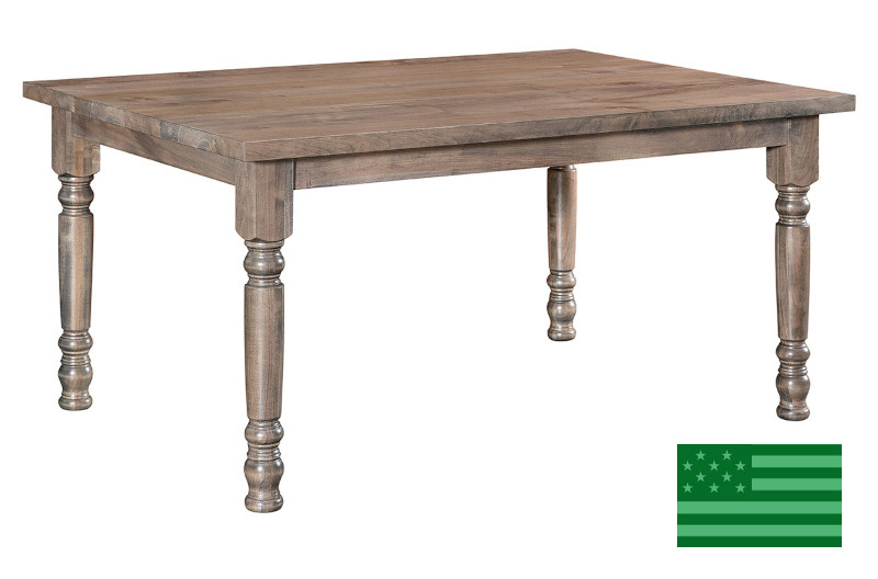 Our Amish Lincoln Dining Table, shown here in Rustic Brown Maple with Haze stain, has standard 1" thick rectangular table top but is also available in 1.25" and 1.5" thicknesses and other shapes (bow end, rounded corners) by request. Our Amish dining room sets are hand made to order with solid hardwoods sustainably grown and harvested in America; email us to customize your table.