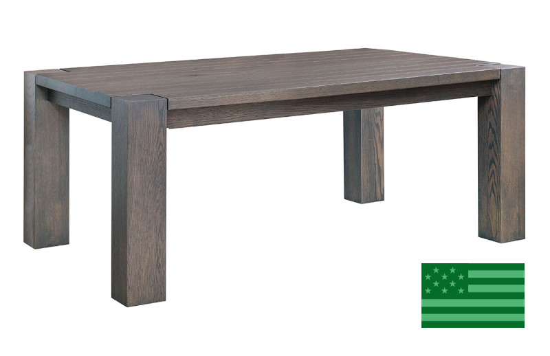 Our Amish Frazier Dining Table, shown here in Red Oak with Gray Burn stain, has a standard 1" thick rectangular table top but is also available in other thicknesses (1.25", 1.5", and 1.75") by request. Our Amish dining room sets are hand made to order with solid hardwoods sustainably grown and harvested in America; email us to customize your table.