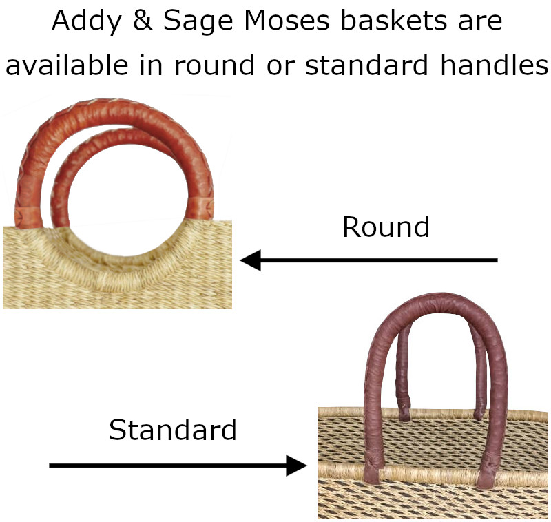 Our Addy & Sage Onyx Akili Ghanaian Moses Basket is hand woven in Ghana of natural elephant grass with your choice of leather or unwrapped (vegan) handles. Each basket is handmade and truly one of a kind; ships directly from the weaver to you.