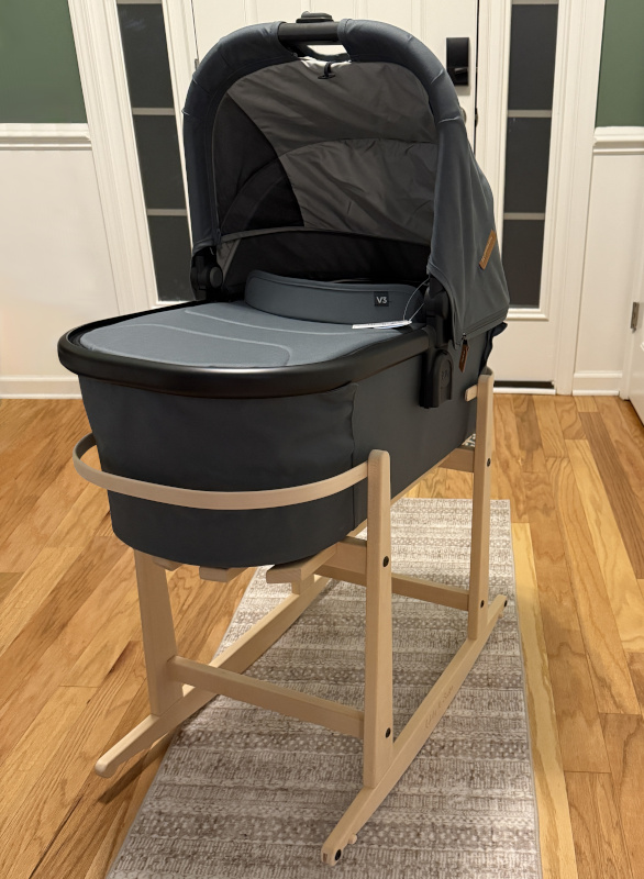 Our Addy & Sage Rocking Stand for UPPAbaby V2 & V3 Stroller Bassinets is a beautifully hand made solid wood stand that allows you to keep your newborn close at all times. For your little one's comfort and safety, we have added extra support under the bassinet to prevent any soft spots or gaps. Hand made in the USA. Bassinet is not included.