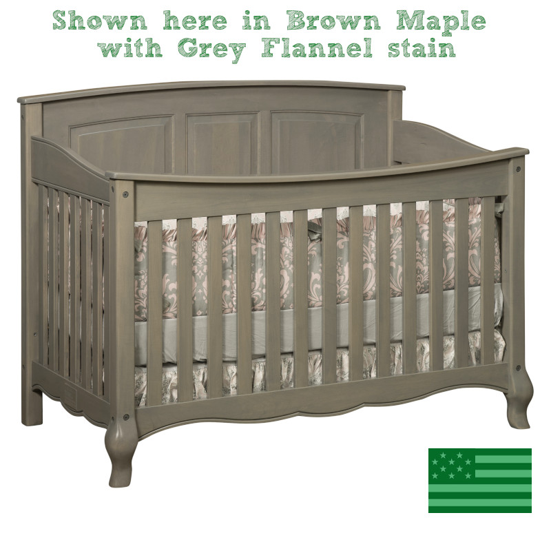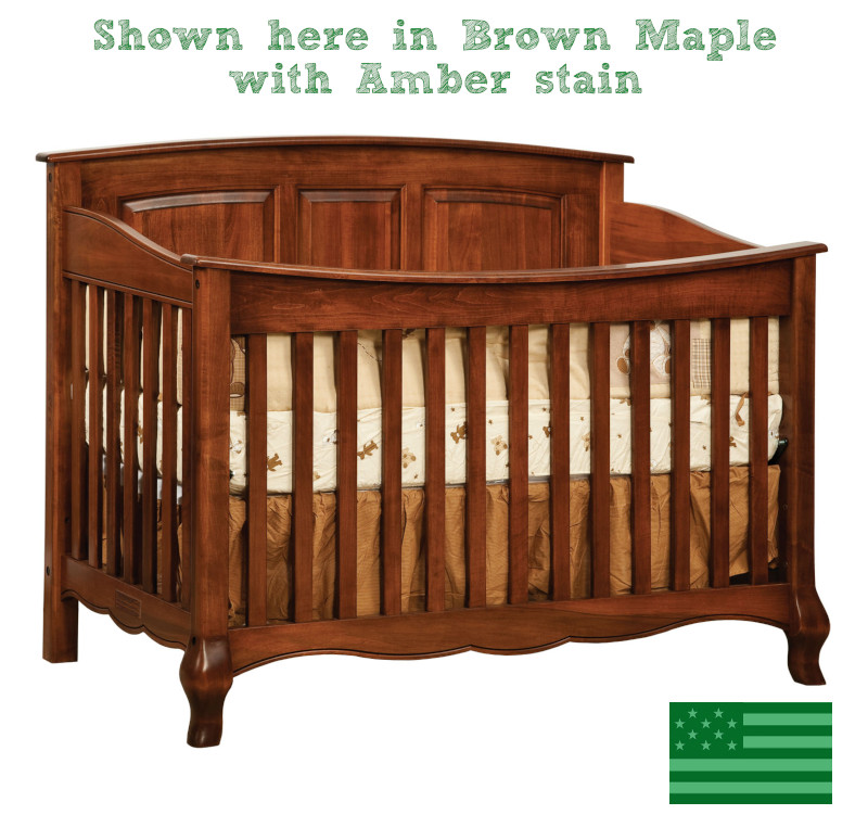 Our Amish French Country Slats 4 in 1 Convertible Baby Crib is handmade in the USA by skilled Amish craftsmen employing old world woodworking techniques. Our American made baby cribs are made entirely of solid wood grown & harvested responsibly in the USA. These solid wood baby cribs are convertible & can grow with your child into toddler beds, day beds & full beds. Our convertible baby cribs fit standard baby crib mattresses. Made in Indiana.