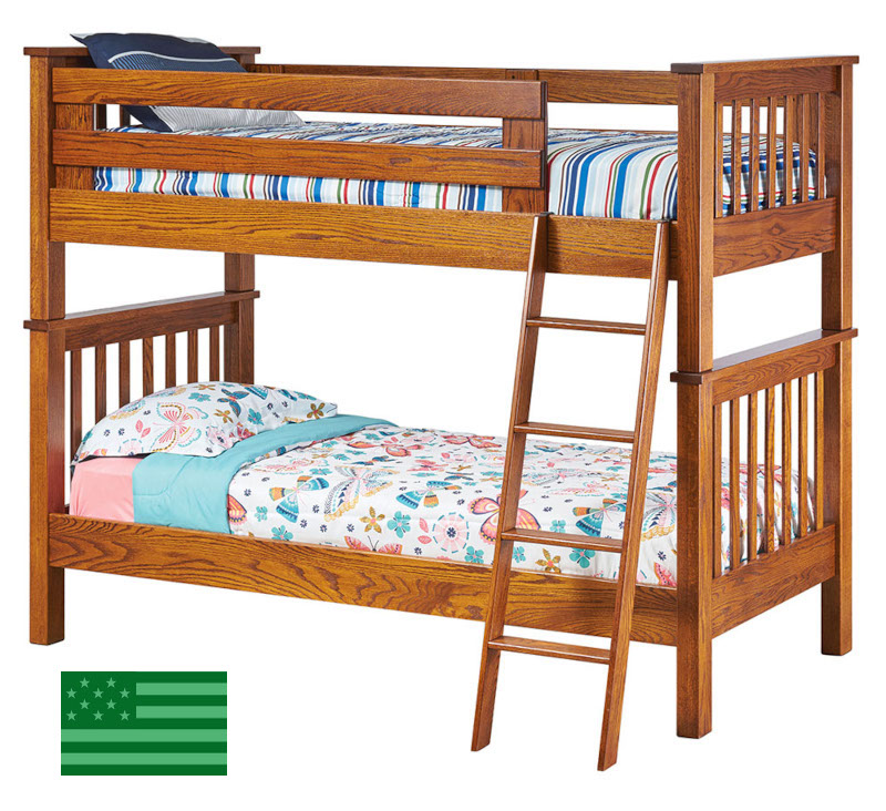 Our Amish Makenzie Bunk Bed is handmade in the USA by skilled Amish craftsmen and fits two standard twin mattresses. This beautiful American made bunk bed is made entirely of solid kiln dried hardwoods grown & harvested responsibly in the USA. Many of its features of this solid wood bunk bed can be customized; email us if interested in customizing your bunk bed. Hand made in Ohio.