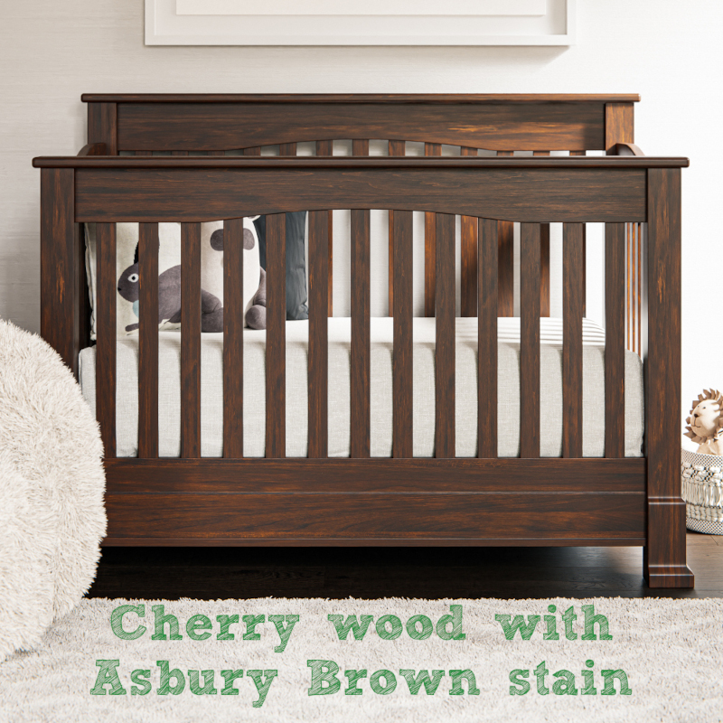 Our Amish Montana Slats 4 in 1 Convertible Baby Crib, shown here in Brown Maple with Almond stain, is beautifully bench crafted by skilled Amish craftsmen employing old world woodworking techniques. Our American made baby cribs are made entirely of solid wood, grown & harvested responsibly here in the USA. Our solid wood baby cribs are convertible & can grow with your child into toddler beds, day beds & full beds. Fits a standard baby crib mattress. Made in Indiana.