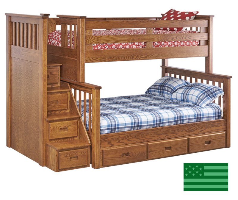 Our Amish Morgan Bunk Bed with Steps, shown here with an optional under bed drawer unit, is handmade in the USA by skilled Amish craftsmen and fits two standard size mattresses. This beautiful American made bunk bed is made entirely of solid kiln dried hardwoods grown & harvested responsibly in the USA. Many of its features can be customized; email us if interested in customizing your bunk bed. Hand made in Ohio.
