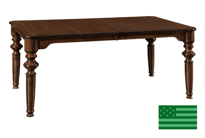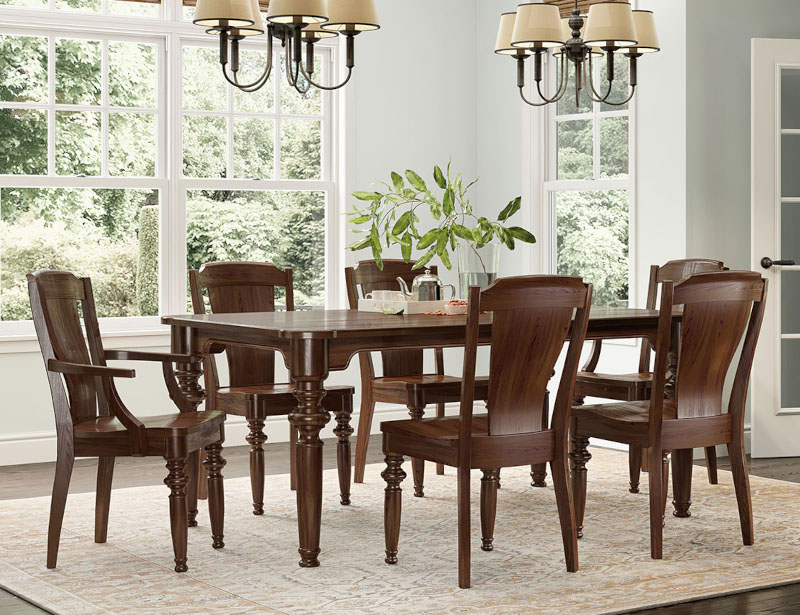 Our hand made Amish Chancellor Dining Table, shown here in Brown Maple with Coffee stain (dining room set is shown in Red Oak with Museum stain), features a 1" thick solid top with a standard roundover edge. Our Amish dining room sets are made with solid hardwoods sustainably grown and harvested in the USA and can be customized; email us for customization. Made in Indiana.