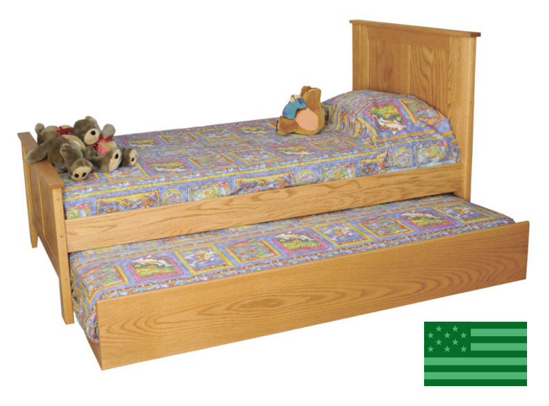 Our Amish Madison Trundle Bed (bed shown in Red Oak, case goods shown in Brown Maple) is handcrafted in the USA by skilled Amish woodworkers and features a built in trundle that is on casters. Our American made trundle bed is made of solid wood grown & harvested responsibly in the USA. Our solid wood trundle bed features standard dovetailed joints and fits a standard size mattress. Our American made children's furniture is custom made and many of its features can be customized; email us if you'd like to customize this trundle bed. Made in Ohio.